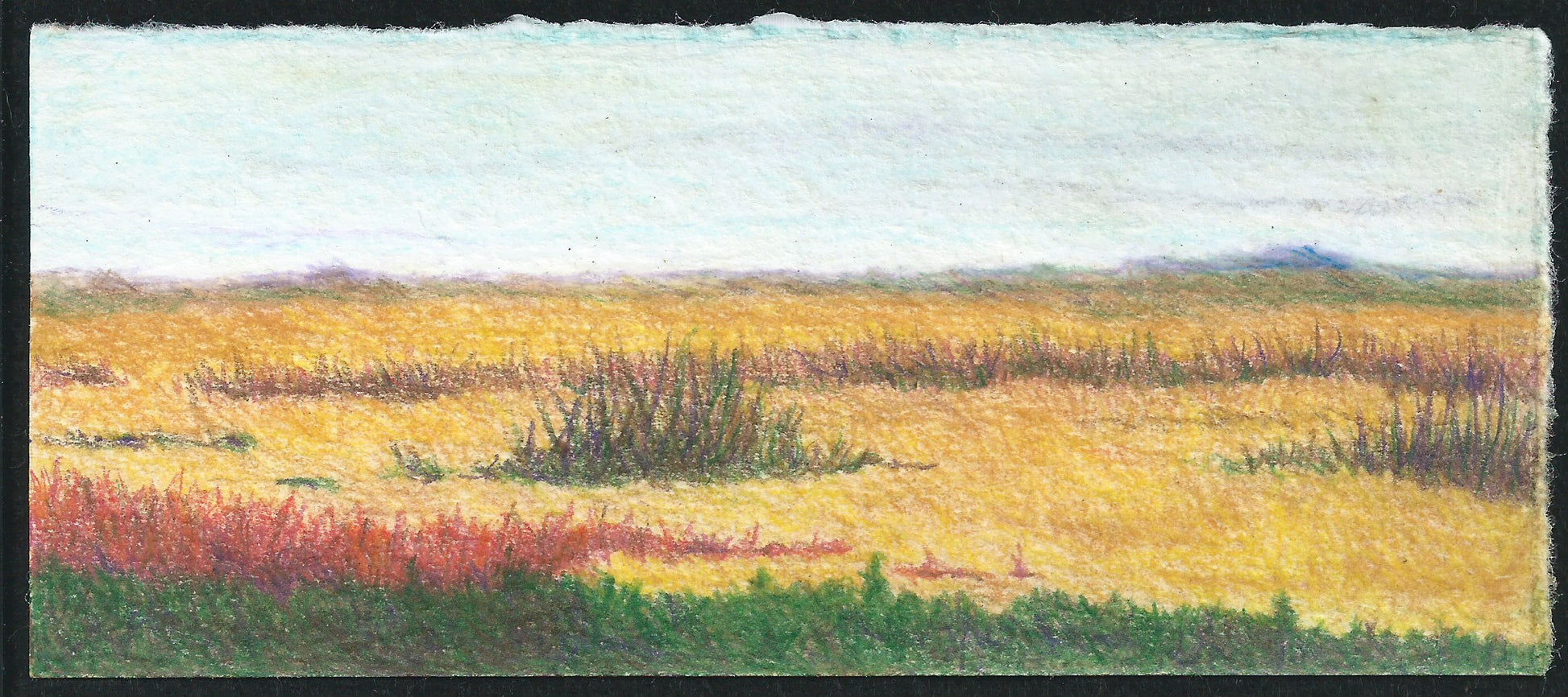 This is an original, small, drawing of a view across Cheyenne Bottoms, Kansas from NE Road 60. A place of wide vistas with yellows, greens, and rusty reds below a blue sky. It was created in 20°F weather while sitting in the cab of a pickup truck. I used Blick Art pastel chalks and Prismacolor pencils, then sealed with Polycrylic.