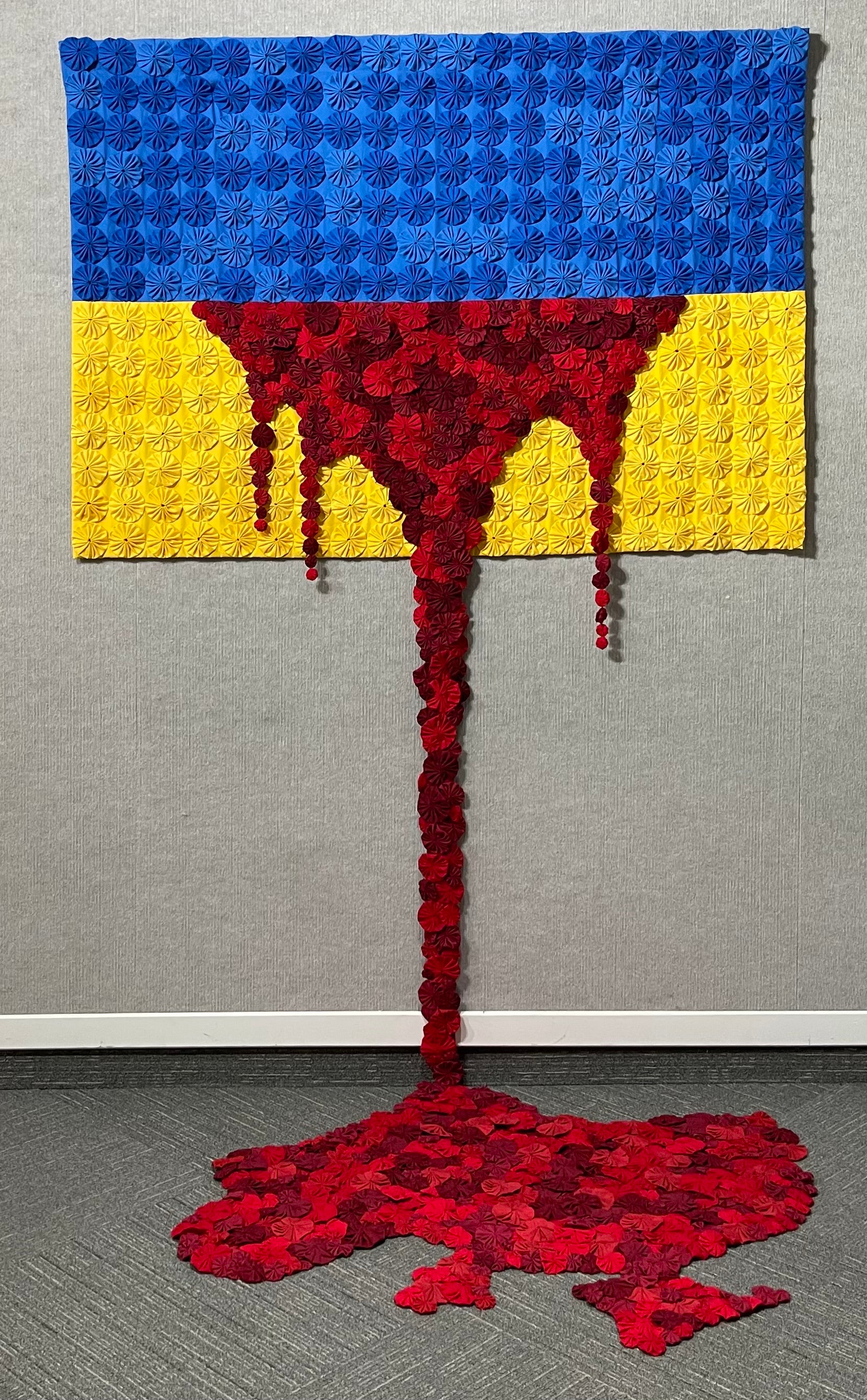This large, quilted work was inspired by President Zelensky's speech to the U.S. congress. He stated that, "Every inch of my country is covered in blood."