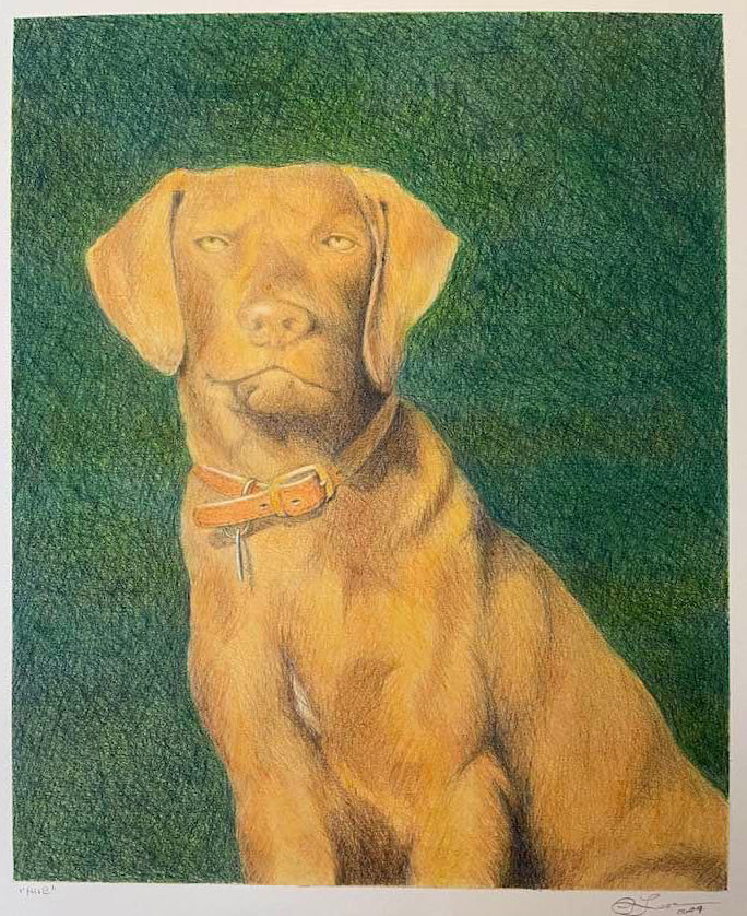 Hub was my husband’s hunting pal. He is no longer with us. Hub was a handsome Chesapeake Bay Retriever who loved bird hunting. He was a very silent guy and hardly ever barked. This portrait of Hub was my husband’s Valentine Day gift. I’ve completed portraits of all his hunting dogs.
