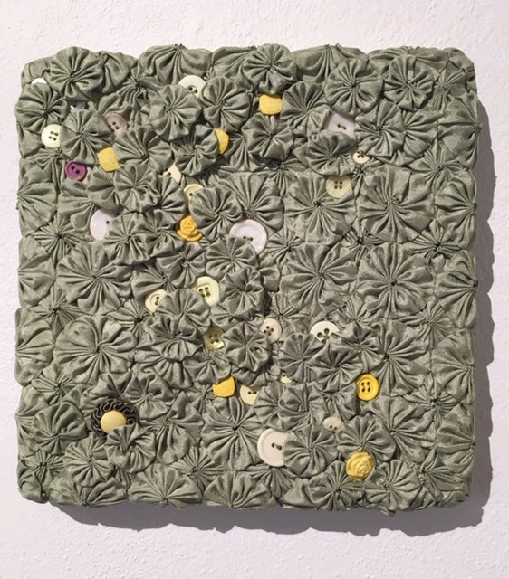 When we moved my mother to assisted living, I found a small glass jar of buttons during her estate sale. I have incorporated these buttons into this fabric yo-yo piece. Her favorite color was green. This little panel is a tribute to my mother.