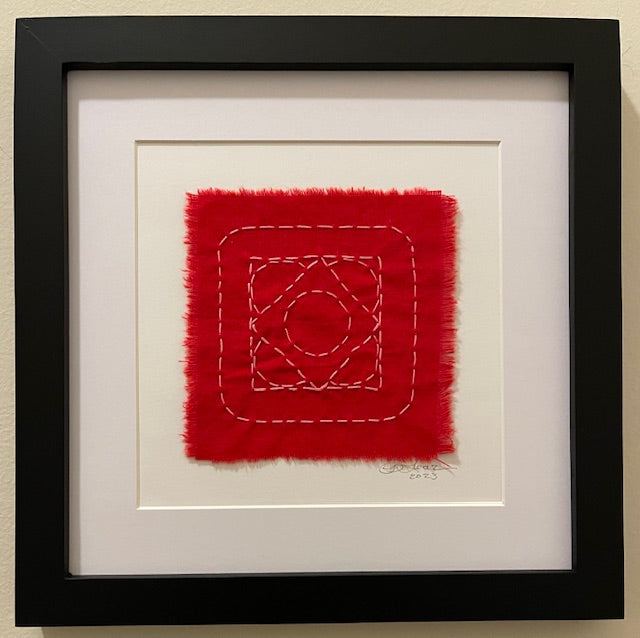 I used light pink thread on a bright red fabric when creating this lobed-diamond design. This type of running-stitch embroidery is known as Sashiko. Sashiko originated in Japan as a way for poorer people to repair, and at the same time, embellish their garments. Sashiko embraces the philosophy of “no waste” and thriftiness.