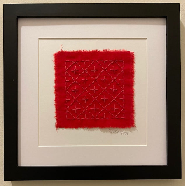 This Sashiko embroidered pattern consists of stars within diamnonds. I used deep red thread on a bright red fabric. Sashiko originated in Japan as a way for poorer people to repair, and at the same time, embellish their garments. Sashiko embraces the philosophy of “no waste” and thriftiness.
