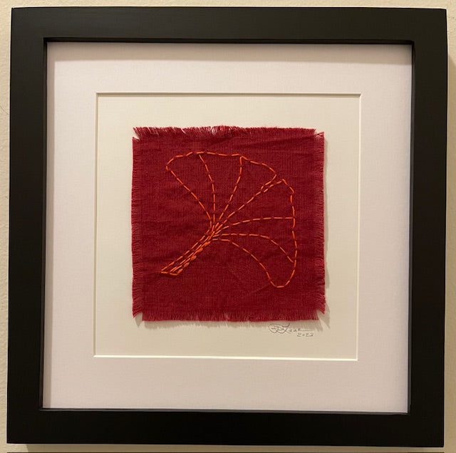 I used bright red thread on a deep red fabric to embroider this Ginkgo leaf in a technique known as Sashiko.